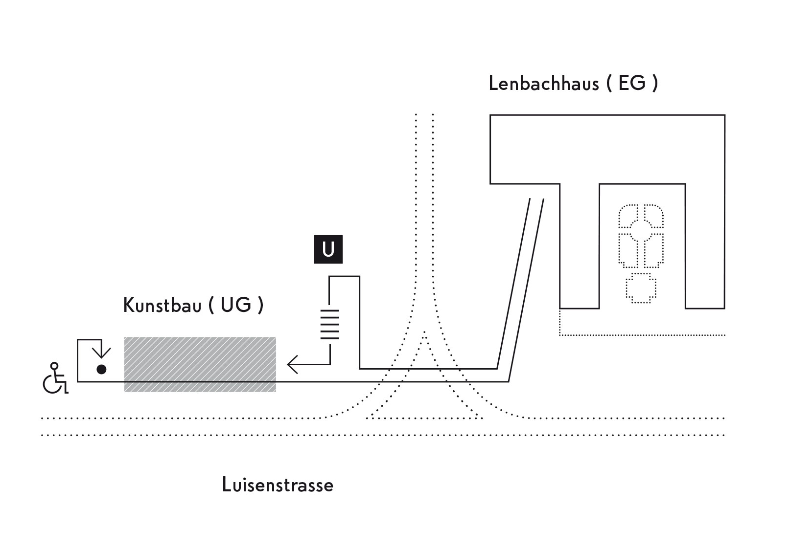 Zum offiziellen Eingang führen nur Rolltreppen. Besucher*innen mit Rollstuhl oder Gehhilfen können einen Aufzug nutzen. Dieser befindet sich in der Luisenstraße 29 bei der Gaststätte Rhaetenhaus / Einfahrt Berufsschulzentrum. Der Aufzug muss durch unser Personal bedient werden. Melden Sie sich bitte über die Gegensprechanlage am Aufzug. Alternativ kann auch eine Begleitperson an der Kasse des Kunstbaus Bescheid geben. Der Aufzug ist für alle Rollstuhlbreiten geeignet.