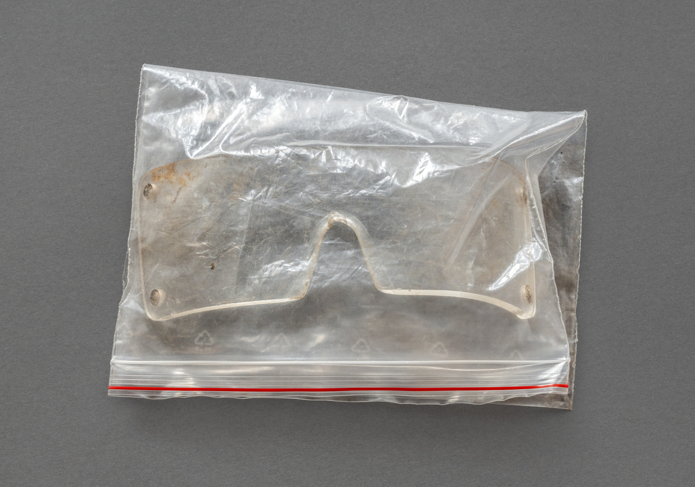 Eine Schutzbrille aus Plexiglas steht am Anfang der Ausstellung "Eingestellte Gegenwarten" von Franz Wanner (*1975, Bad Tölz). Die Brille wurde bei Grabungen auf dem Gelände des ehemaligen Konzentrationslagers Sachsenhausen geborgen. Über die inhaftierte Person, die zur Zwangsarbeit in der Rüstungsindustrie eingesetzt war und mit der Brille ihr Augenlicht schützte, gibt es bislang keine auffindbaren Informationen. Ihr Wunsch sich zu schützen, zeigt sich bis heute an diesem Objekt.