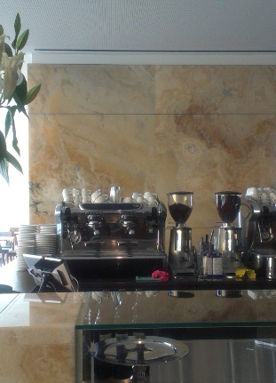 Das Innendesign des ELLA mit seinen bis zum Boden reichenden Fenstern ist in warmen Onyxmarmor, Bronze und Nussbaumholz gestaltet. Ab diesem Sommer, nach der offiziellen Eröffnung des Neuen Lenbachhauses, wird auch dort Kunst an den Wänden zu sehen sein.