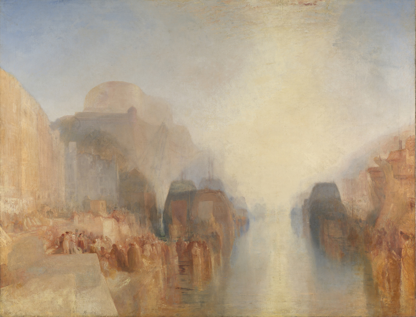1819 reiste Turner erstmals nach Venedig, was seine Malerei für immer verändern sollte. Der Porträtmaler Thomas Lawrence hatte in einem Brief an Farington erklärt, warum Turner unbedingt nach Italien kommen sollte – unter anderem, um die "Verschmelzung von Erde und Himmel" in seinen unnachahmlichen Farbtönen einzufangen: "He has an elegance and often a greatness of invention that wants a scene like this for its free expansion; [...] the subtle harmony of this atmosphere [...] wraps every thing in its own milky sweetness." Turner gab die "milchige Süße" der Lagunenstadt in einem träumerischen, zeitlosen Ausdruck wieder, der ihn zu einem modernen Maler machte. Sein Malstil veränderte sich in Italien völlig; auf einem pastelligen, fahlen Untergrund tauchten nun Schemen und Konturen flüchtig auf, wie Geister der Vergangenheit. Turner zeichnete weniger massive Gebäude oder Strukturen, sondern Luft und Raum.