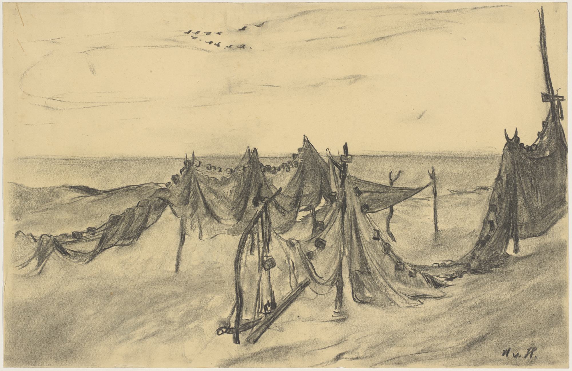 Hans von Hayek, Fischernetze, Kohle, 32 cm x 49,2 cm, Städtische Galerie im Lenbachhaus und Kunstbau München