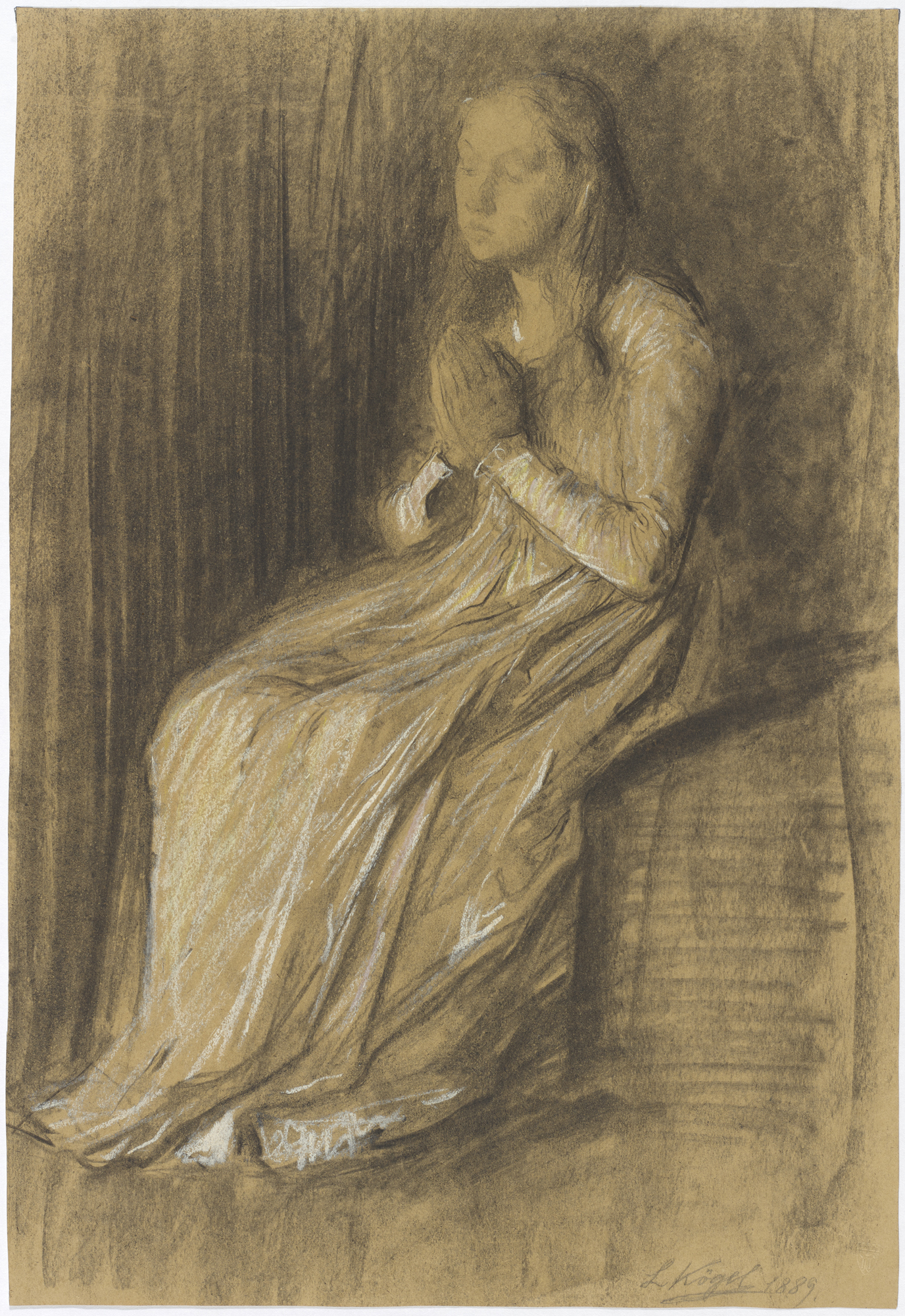 Linda Kögel, Studie zu einer Maria, 1889, Kohle, mit weißer und gelber Kreide gehöht, 44,1 cm x 30,3 cm, Städtische Galerie im Lenbachhaus und Kunstbau München