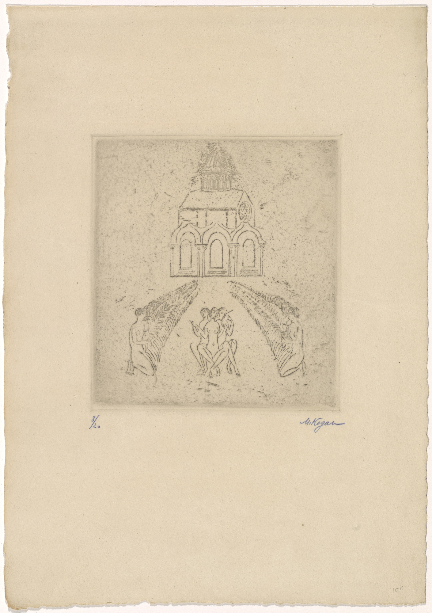 Moissey Kogan, Tanzszene vor Tempel, Radierung, 35,9 cm x 25,2 cm, Städtische Galerie im Lenbachhaus und Kunstbau München