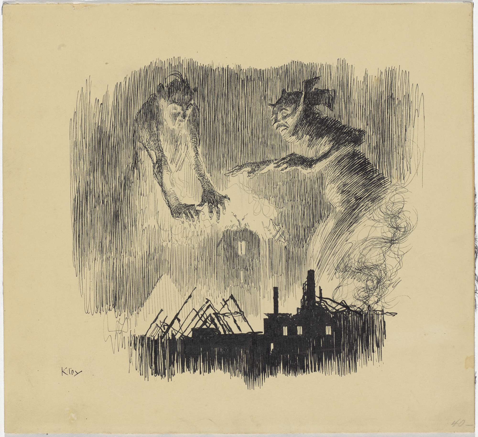 Heinrich Kley, Teufelstanz über brennender Stadt, Federtuschzeichnung, 27 cm x 29,8 cm, Städtische Galerie im Lenbachhaus und Kunstbau München