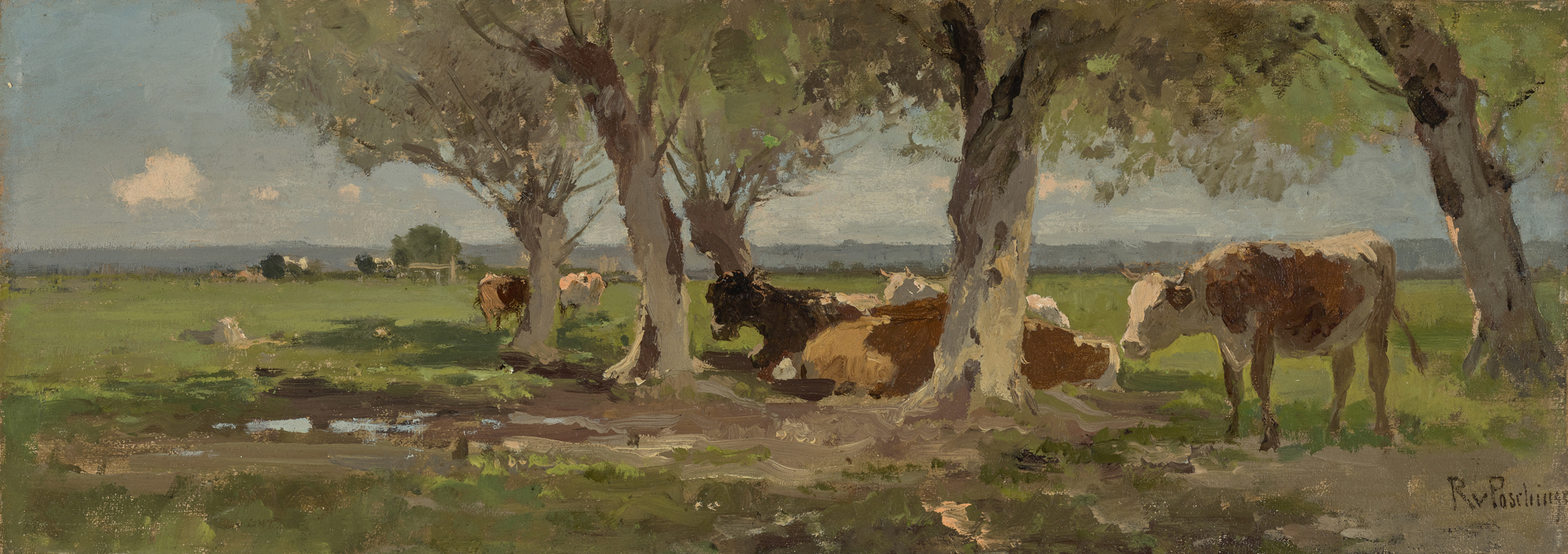 Richard von Poschinger, Weidende Kühe, Öl auf Pappe, 17,5 cm x 44,8 cm, Städtische Galerie im Lenbachhaus und Kunstbau München