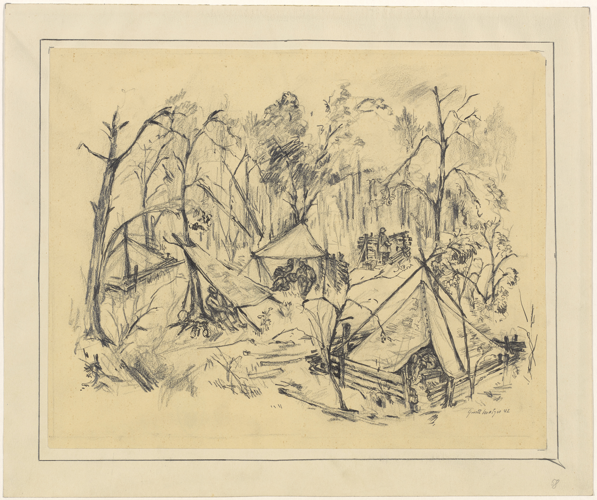 Gustl Kratzer, Zeltlager im Wald, 1942, Bleistift- und Tuschezeichnung, 27,3 cm x 34 cm, Städtische Galerie im Lenbachhaus und Kunstbau München