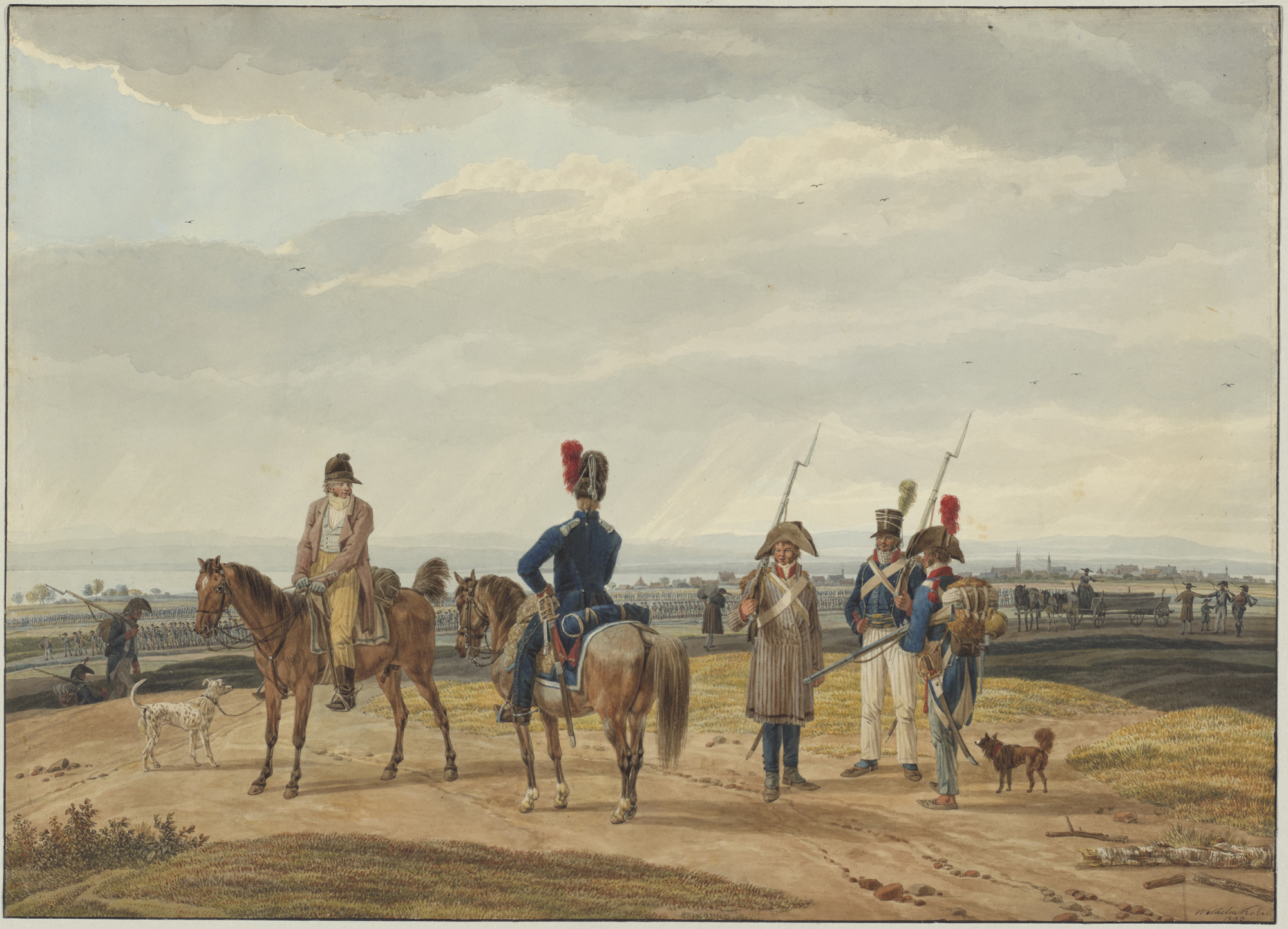 Wilhelm von Kobell, Begegnung mit französischen Soldaten, 1803, Bleistift, Aquarell, Feder, gerandet, 32 cm x 44,5 cm, Städtische Galerie im Lenbachhaus und Kunstbau München