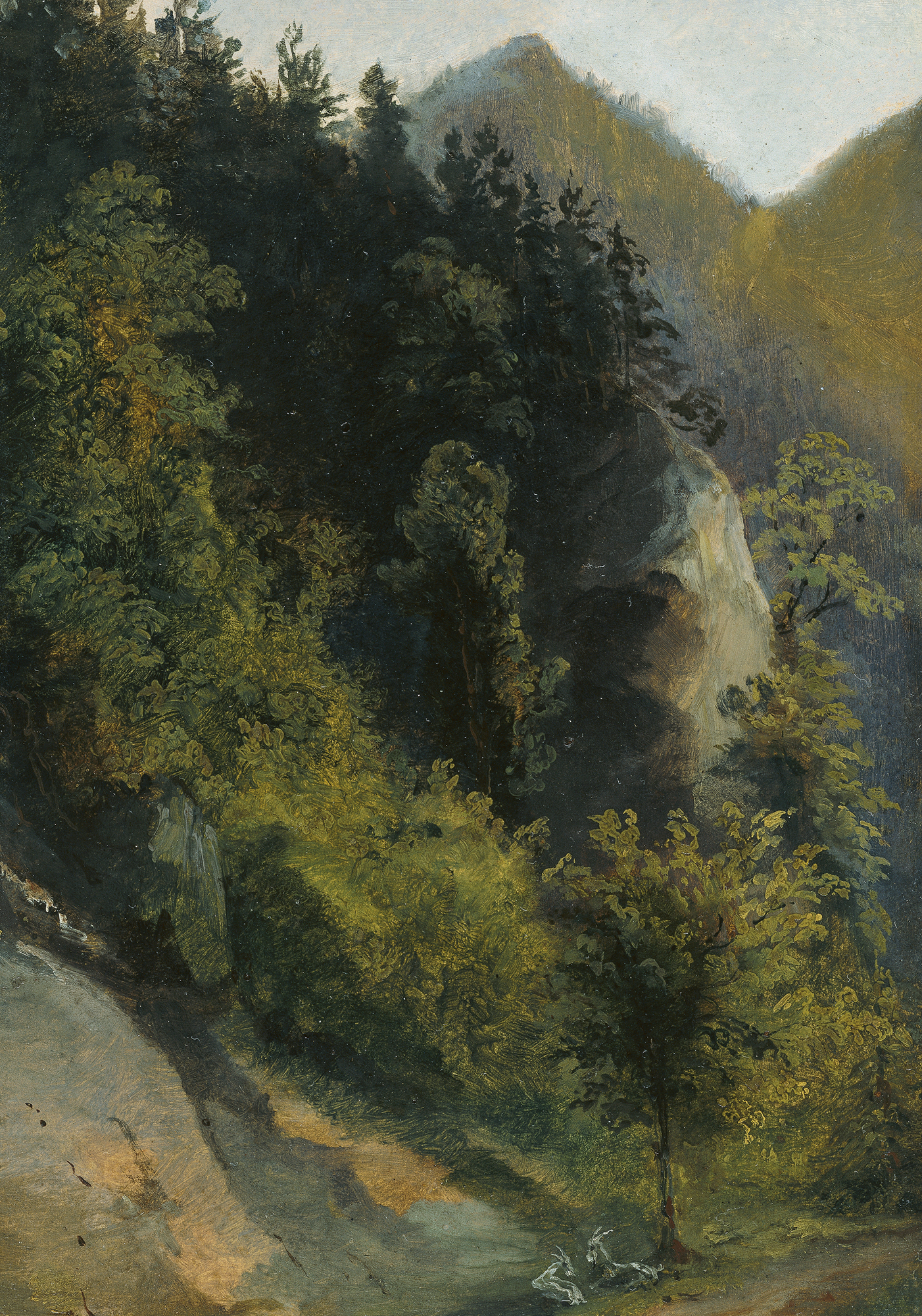 Johann Georg von Dillis, Bewaldetes Felstal mit Ziegen, n. d., Öl auf Papier auf Malpappe, 22,5 cm x 15,8 cm x 0,5 cm, Städtische Galerie im Lenbachhaus und Kunstbau München, Dauerleihgabe der Christoph Heilmann Stiftung, Foto: Engelbert Seehuber