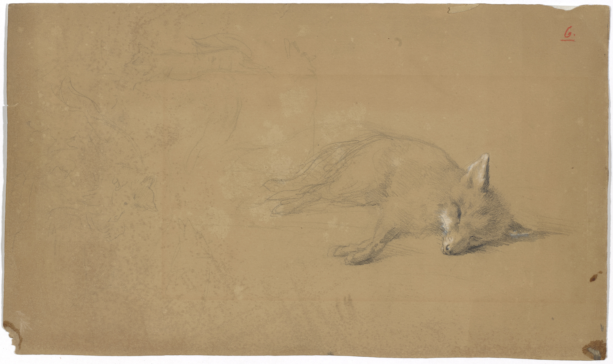 Otto Gebler, Erlegtes Füchslein, Blei weiß gehöht auf braunem Tonpapier, 17,5 cm x 30,2 cm, Städtische Galerie im Lenbachhaus und Kunstbau München