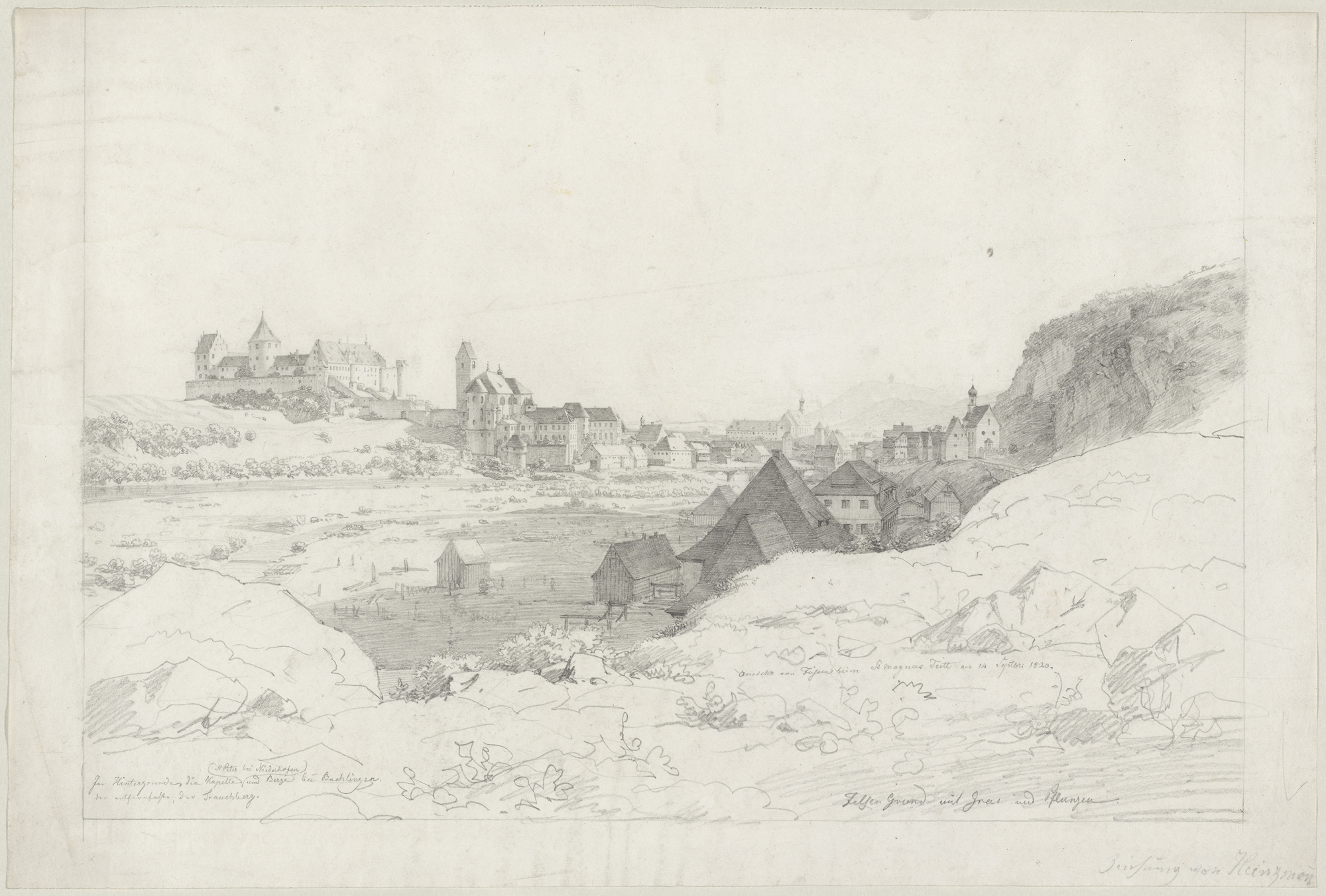 - u. l.: Im Hintergrund die Kapelle St. Peter bei Niederhofen und Berge bei Bachlingen, der entfernteste, der Trauchberg; u. r.: Ansicht von Füssen beim St. Magnus tritt am 14. Septbr. 1820| Felsen Grund mit Gras und Pflanzen| Zeichnung von Heinzmann