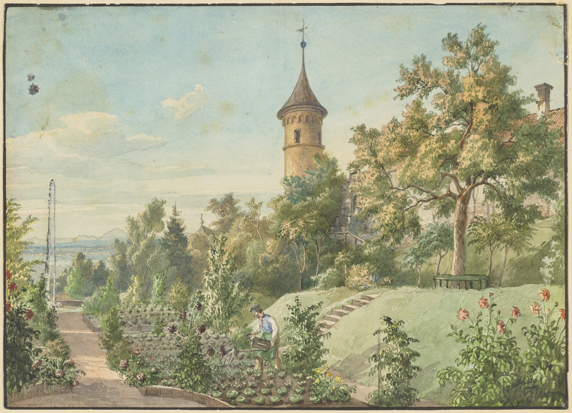 Lorenz Quaglio, Gemüsegarten von Schloß Kaltenberg, Aquarell auf Blei gerandet, 16,8 cm x 23,3 cm, Städtische Galerie im Lenbachhaus und Kunstbau München