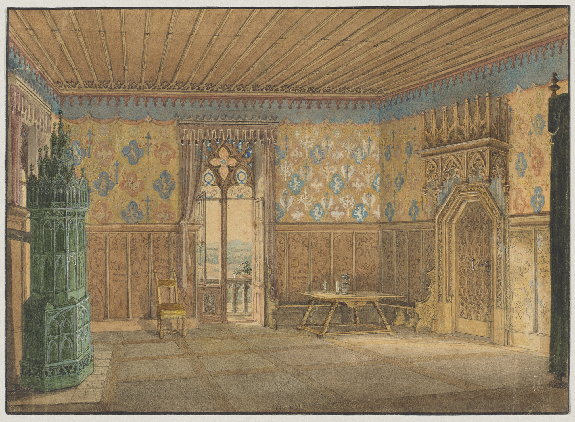 Lorenz Quaglio, Interieur in Schloß Kaltenberg mit Blick durch die offene Balkontür in die Landschaft, um 1847, Aquarell, Deckfarben, Gold, 16,8 cm x 23,3 cm, Städtische Galerie im Lenbachhaus und Kunstbau München