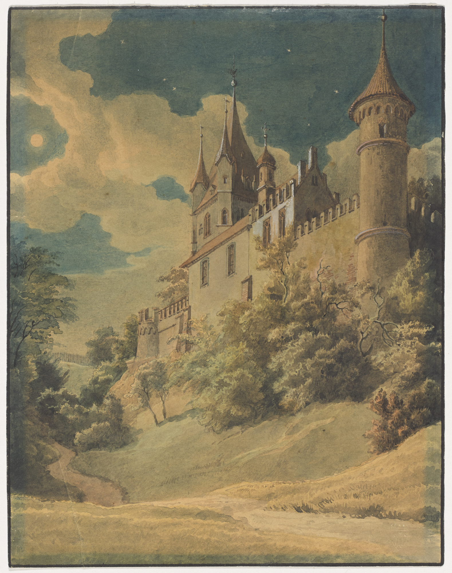 Lorenz Quaglio, Schloß Kaltenberg im Mondlicht (gesehen von unten, mit Kapellenbau und Mauer), Aquarell auf Blei gerandet, 23,7 cm x 18,5 cm, Städtische Galerie im Lenbachhaus und Kunstbau München