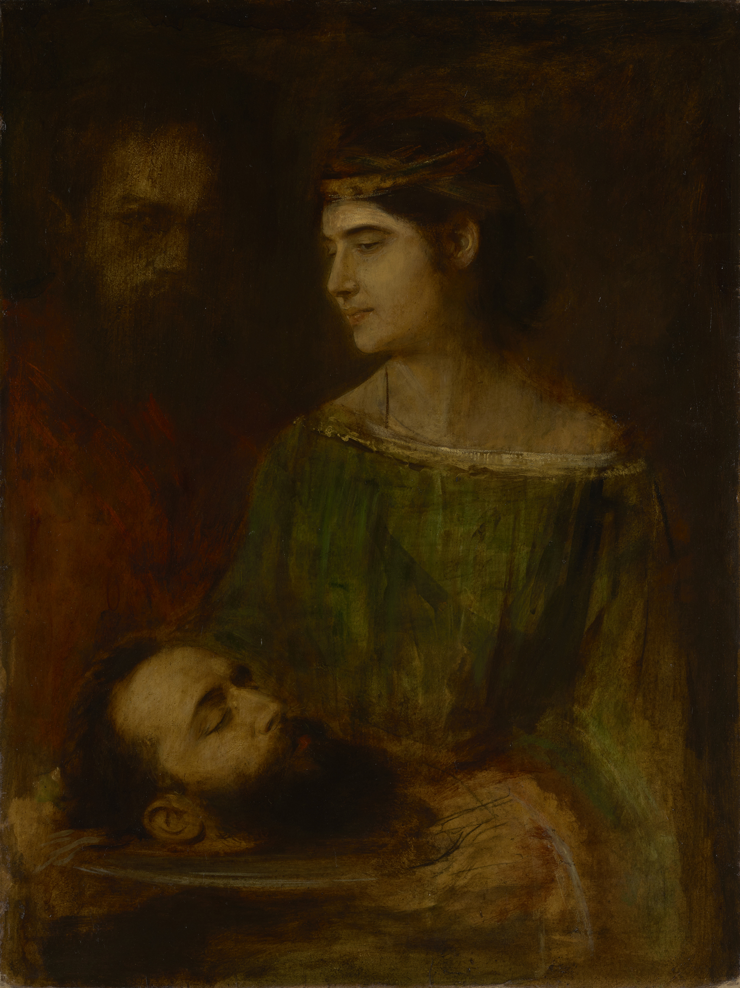 Franz von Lenbach, Tochter des Herodias mit dem Haupt des Johannes; Halbfigur stehend, 1878, Öl auf Pappe, 94 cm x 71,9 cm x 0,7 cm, Städtische Galerie im Lenbachhaus und Kunstbau München, aus dem Nachlass Franz von Lenbach, Schenkung Lolo von Lenbach 1925