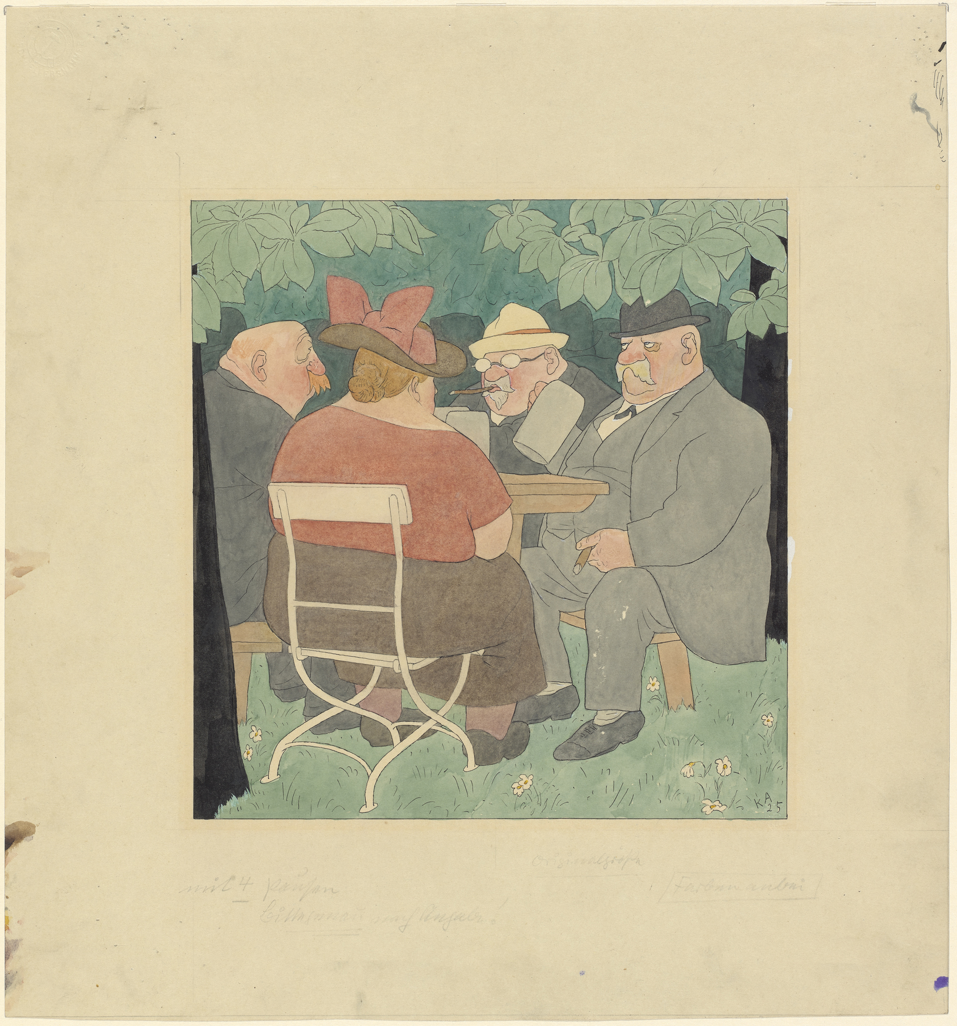 Karl Arnold, Vom Deutschen Museum (Dees mit dem deutschen Museum wird sie aa net halt'n - wer redt denn heut no vo der Pinakothek.), 1925, Tusche Aquarell gerandet, Städtische Galerie im Lenbachhaus und Kunstbau München, © VG Bild-Kunst, Bonn 2018, Foto: Lenbachhaus, Ernst Jank