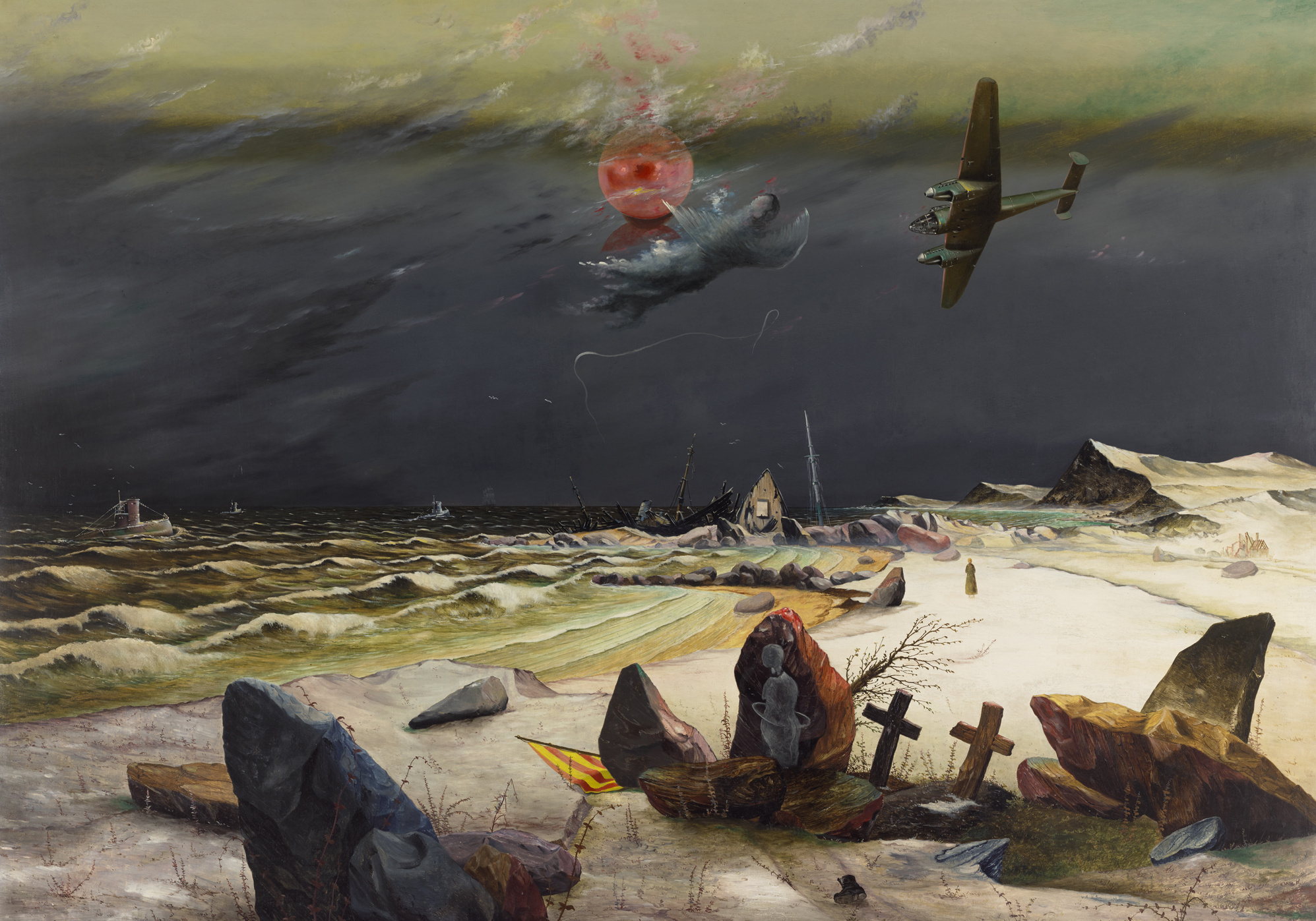 The representatives of the New Objectivity in the Lenbachhaus’s collections may be roughly divided into two camps: on the one hand, artists such as Rudolf Schlichter, Christian Schad, Karl Hubbuch, Christoph Voll, and Willi Geiger tend to articulate a critical view of social realities; on the other hand, Munich painters like Georg Schrimpf and Alexander Kanoldt, influenced by the Italian artists in the orbit of the magazine "Valori Plastici" (Carlo Carrà, Giorgio de Chirico), eschew social criticism and often depict distinctively idyllic scenes. Josef Scharl’s "Fallen Soldier" and Franz Radziwill’s "The U-Boat War / Total War / Lost Earth" address the events of World War I with a view to the artists’ own present-day reality. The multi-part title of Radziwill’s picture suggests the vicissitudes of the history of its creation, reflecting the artist’s shifting artistic and political convictions and the troubled relationship between the artists of the New Objectivity and Nazi cultural policies.